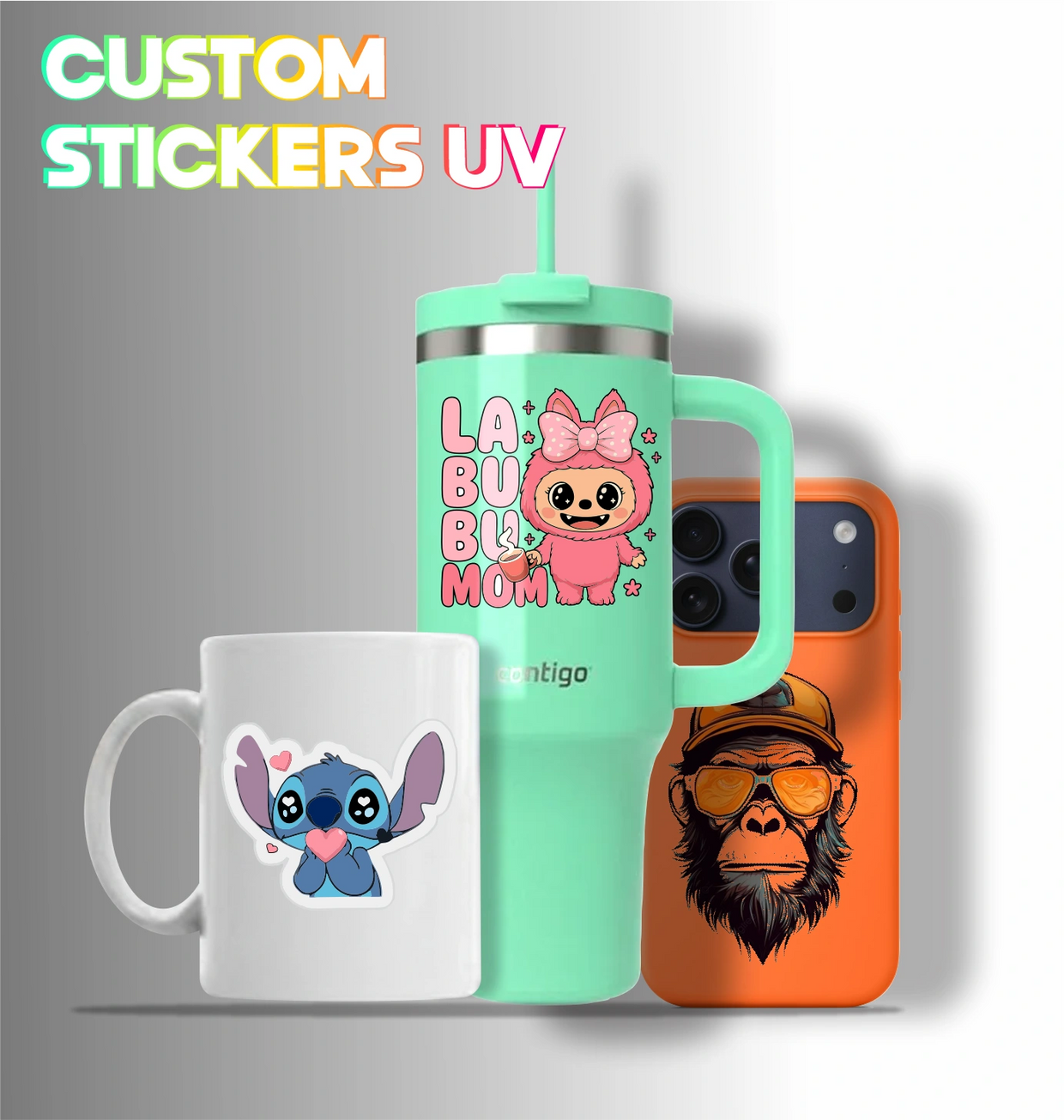 These UV custom stickers come with a strong, durable adhesive that sticks securely to a variety of surfaces. Perfect for personalizing items, promoting your brand, or creating gifts, these stickers are resistant to water, fading, and everyday wear. The UV coating adds a glossy, high-quality finish that makes your designs stand out and ensures long-lasting durability.